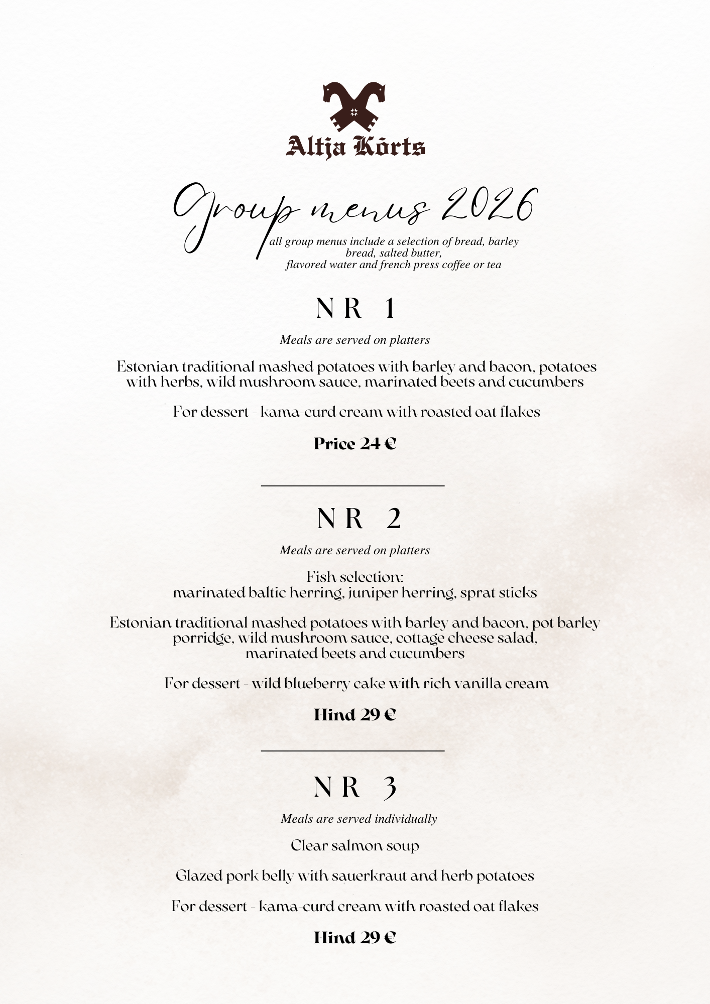Welcome to Altja Tavern, where tradition meets nature. Enjoy our authentic Estonian cuisine, featuring classics like mulgipuder, black bread, and fresh sprat and Baltic herring. Delight your taste buds with sorrel soup and wild blueberry cake, perfectly complemented by a refreshing cocktail or house lemonade from the tavern's bar. Experience the genuine flavors of Estonian cuisine in every bite.
